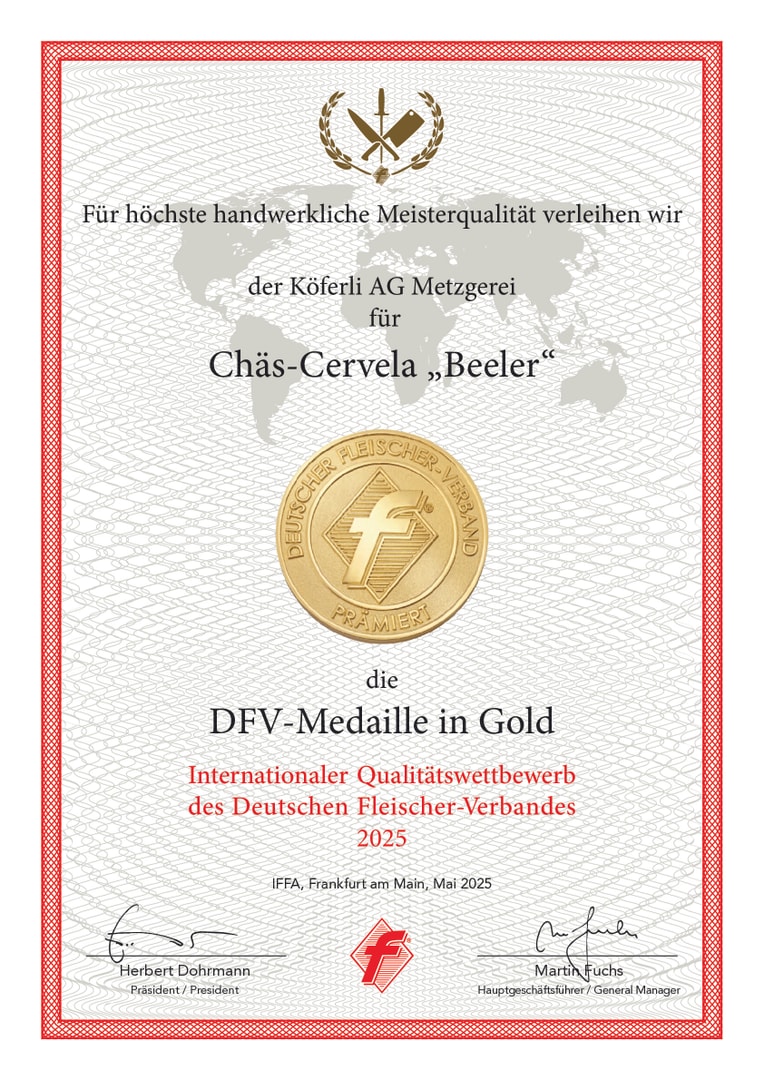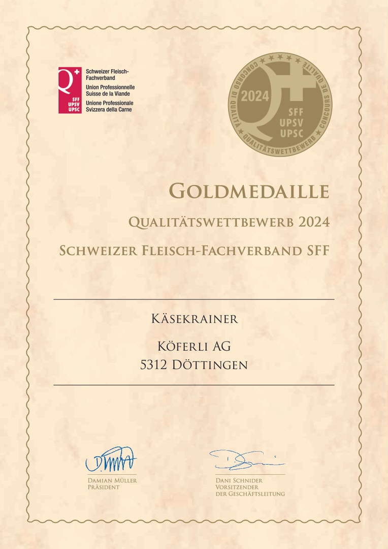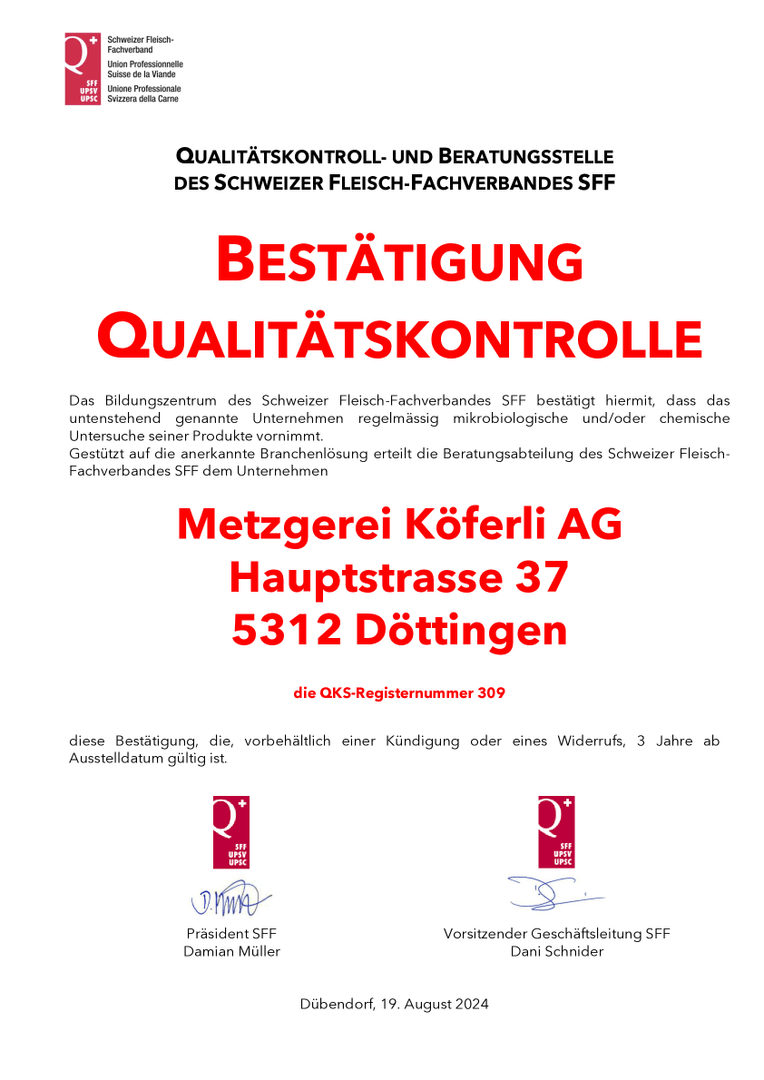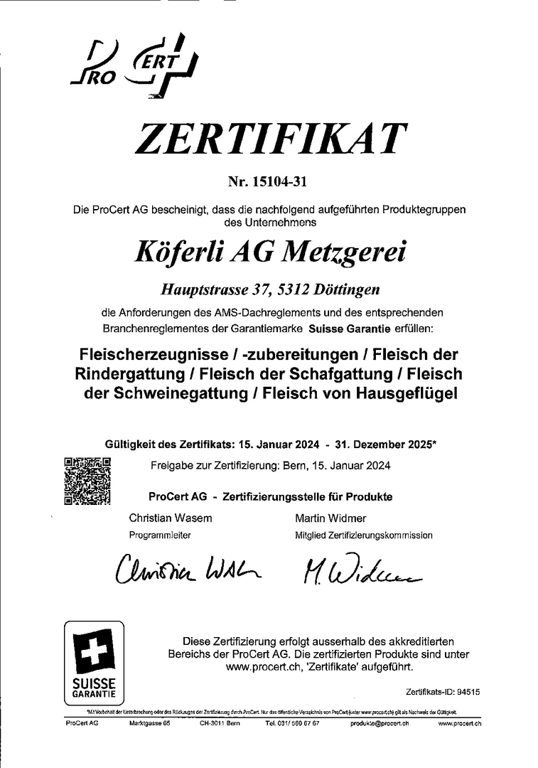 Today, the third generation of the Köferli family is already at work. Elisabeth and Albert have been successfully running the company since 1996. In addition to the store in the heart of the municipality of Döttingen, Köferli also offers a reliable and prompt delivery service for catering businesses and event organizers. From time to time, we also offer courses on meat, fish and cheese. In addition to culinary delights, you can expect a lot of conviviality in these courses. Our customer magazine is also published regularly. In it we reveal tips and tricks and little "butcher's secrets". Use our experience for your success.